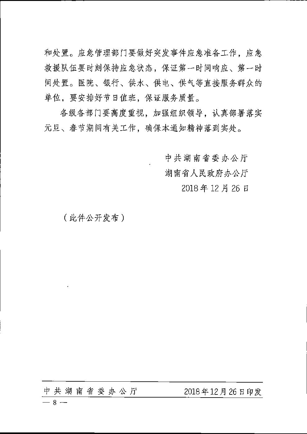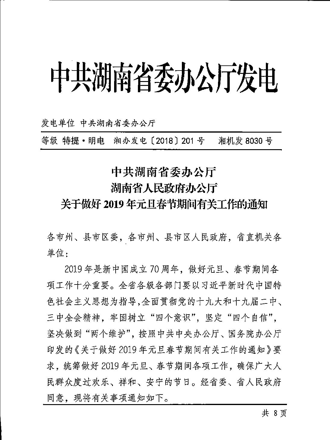 现将《中共湖南省委办公厅 湖南省人民政府办公厅关于做好2019年元旦春节期间工作的通知》(湘办发电[2018]201号)转发给你们, 请结合实际认真贯彻落实。